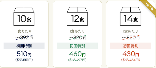10食・12食・14食から選べて、一つあたりのお弁当の単価が安いのは、14食です。