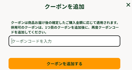 初回クーポンと送料無料クーポンは併用可能なので、忘れずに注文確認画面で、両方のクーポンコードを入力してください。