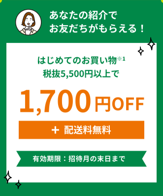 紹介された方は、税抜5,500円以上の注文で使える1,700円OFFクーポン+配送料無料クーポンがもらえます。