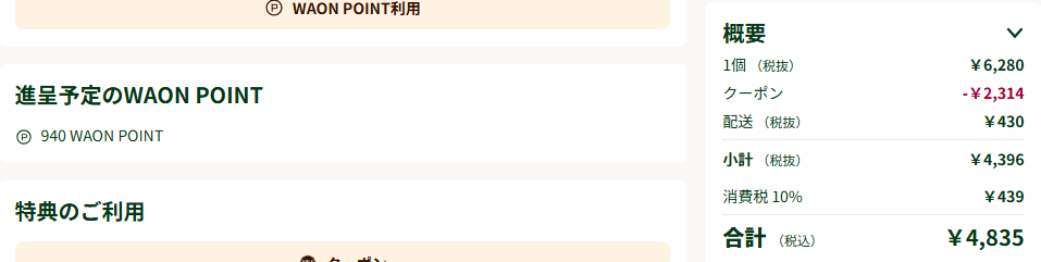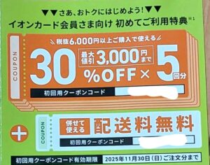 この2つのクーポンは同時に使えるため、割引+配送料0円で、お買い物をすることができます。