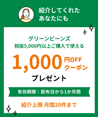 - グリーンビーンズの友達紹介キャンペーン!1,700円OFF+送料無料クーポン